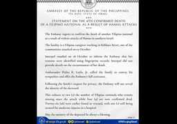 Meanwhile, DFA said Ambassador Pedro 'Junie' Laylo Jr. of the Philippine Embassy in Israel called the family to convey his sympathies and offer the Embassy's full assistance.