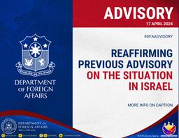MANILA – The Department of Foreign Affairs (DFA) is reaffirming the previous declaration of Alert Level 2 by the Philippine Government for the State of Israel, restricting further deployment of Overseas Filipino Workers (OFWs) there.