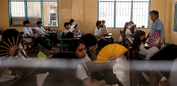 Grade 12 students use hand fans as they attend a class at the Commonwealth High School, in Quezon City, Metro Manila, Philippines, April 18, 2024. REUTERS/Lisa Marie David