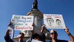 In the French capital of Paris, about 200 people, mostly American, gathered on the Place de la République to protest against Trump. Some gave speeches to denounce the president, with protesters waving banners ranging from "Resist Tyrant", "Rule of Law" "Feminists for Freedom not fascism" and "Save Democracy". One sang and played the Bob Dylan song Masters of War.