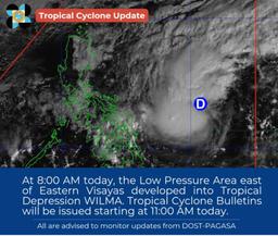 The Philippine Atmospheric, Geophysical and Astronomical Services Administration (PAGASA) reported on Thursday, December 4, that the low-pressure area (LPA) previously monitored east of Eastern Visayas has developed into Tropical Depression ‘Wilma’.