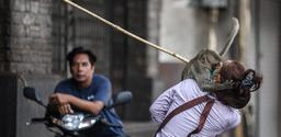 Small children, elderly women and even policemen carried around slingshots to try and scare away the macaques.