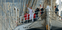 Earlier a flotilla of pleasure boats had welcomed the Belem to French shores.