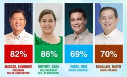 Trailing the President and Vice President is House Speaker Martin Romualdez who gained 70 percent approval and Senate President Juan Miguel 'Migz' Zubiri who had 69 percent approval.