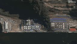 A satellite image shows smoke rising from Russia's Baltic port of Ust-Luga after a Ukrainian attack, in Ust-Luga, Leningrad Oblast, March 27, 2026. Vantor/Handout via REUTERS
