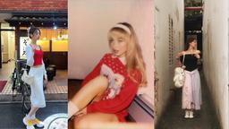 For this look, the k-pop idol is wearing a bright red cami top with a white cardigan and a white patterned midi skirt. She elevated the look with the pearl choker necklace, a handbag, and running shoes with a pop of yellow.
