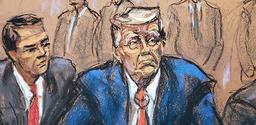 Trump walked into the courtroom wearing a red tie and navy blue suit with an American flag lapel pin. About 10 Secret Service agents stood against the wall behind him.