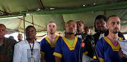 The first day of the military trial took place under a tent in the yard of Ndolo military prison on the outskirts of Kinshasa. The defendants filed in wearing blue and yellow prison-issued tops and lined up before the judge.