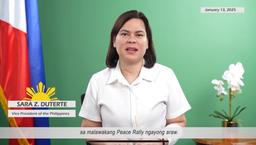 "Taos-puso akong bumabati sa lahat ng lumahok sa malawakang Peace Rally ngayong araw. Ito ay isang makapangyarihang pagpapakita ng pagkakaisa at pananampalataya na ang tanging hangad lamang ay kapayapaan tungo sa kaunlaran ng ating bansa," said the Vice President in a video message on Monday night.