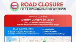 Some roads will be closed starting Tuesday, January 28, to give way for the Chinese New Year countdown, the Manila Public Information Office (MPIO) announced on Monday, January 27.