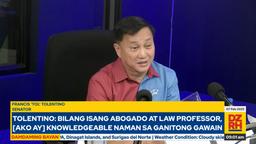 "Marami pong complexities, kasalimuutan ang batas at hindi lang ‘yung ordinaryong batas, saligang batas, na very buhay po ang batas, evolving, na kailangan po natin ng abogado sa Senado – na isang gawaan ng batas," Tolentino said during the Bakit Ikaw: The DZRH Job Interview on Friday.
