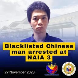 The Bureau of Immigration said on Monday, Nov. 27, that a blacklisted Chinese national has been arrested at Ninoy Aquino International Airport (NAIA) Terminal 3.