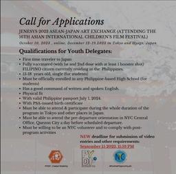 Queries may be sent to internationalprograms@nyc.gov.ph with the subject heading: “JENESYS 2023 ASEAN-Japan Art Exchange (Attending the 16th Asian International Children’s Festival)”.