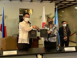 Koshikawa signed and exchanged notes for the two projects with World Food Programme Representative and Country Director Brenda Barton, and FAO Representative Sheila Wertz-Kanounnikoff in a ceremony at the Department of Foreign Affairs.