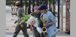 Among them was rapper RM, who greeted Jin with a saxophone to play the group's hit single "Dynamite".