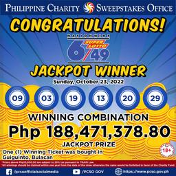 Another to-be-millionaire has secured the Super Lotto jackpot prize of Php 188,471,378.80.