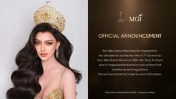 “The Miss Grand International Organization has decided to revoke the title of 2nd Runner-Up from Miss Grand Myanmar 2024, Ms. The Si Nyein due to inappropriate behavior and actions that violated several regulations,” the pageant organization said.