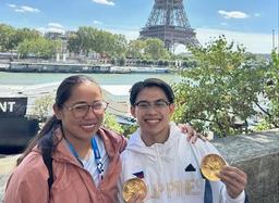 The Philippines's golden athletes—two-time Olympic gold medalist Carlos Yulo and the first Pinoy Olympic gold medalist Hidilyn Diaz—pose before the Eiffel Tower during the Paris 2024 Olympics.